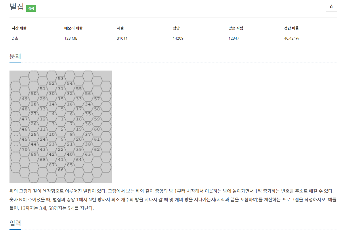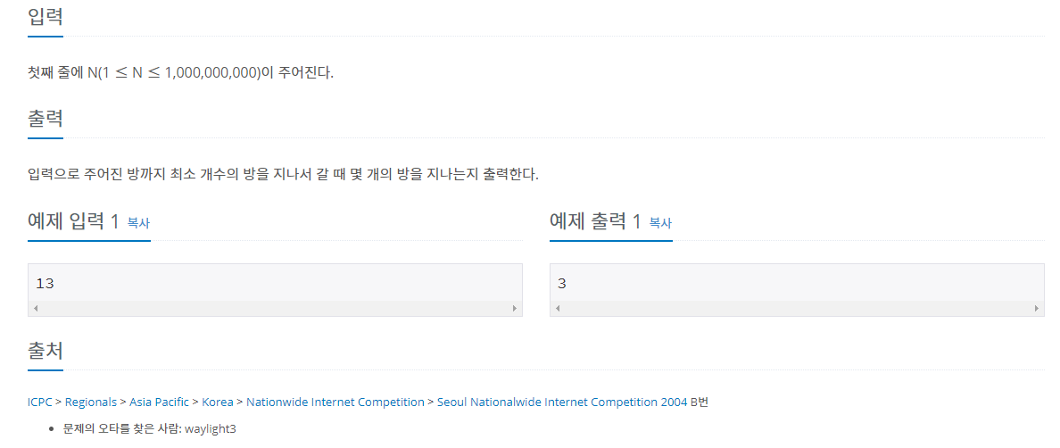 1번방을 기준으로 하였을 때 둘러쌓인 방들의 개수가 한 겹씩 커질때마다 6의 배수로 증가하기 떄문에 flag를 6씩 증가시켰다. 1번방도 지나는 방에 포함시켜야함으로 ans를 1로 초기화하고 문제를 풀었다.